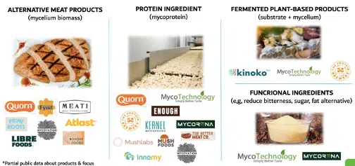 Marlow Food, which originally developed and commercialized Quorn, paved the way to adopt mycelium as a food component through precise strain selection (out of 3,000 screened organisms), a proprietary industrial-scale process development, and successfully obtaining regulatory approval (which took 10 years!). The company was purchased by Monde Nissin, a Philippines-based company, for GBP 550 million (USD 831 million) in 2015. Quorn is sold today in 15 countries, with 620 employees at three sites.